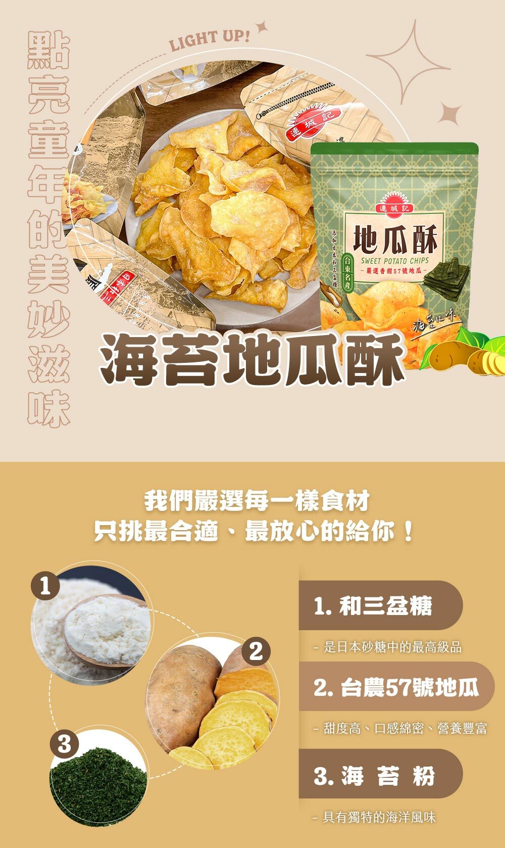 *成分:台農57號番薯、烤酥油{大豆油、抗氧化劑(丙二醇、第三丁基氫醌、檸檬酸)}、糖粉、食鹽、和三盆糖、海苔粉